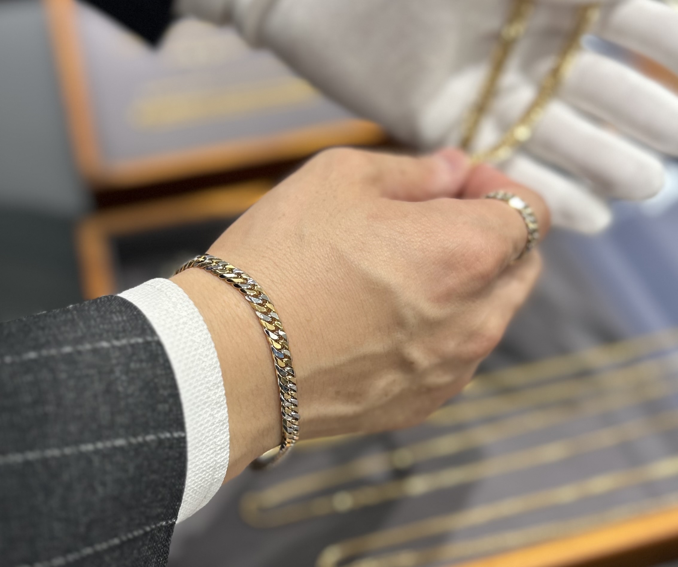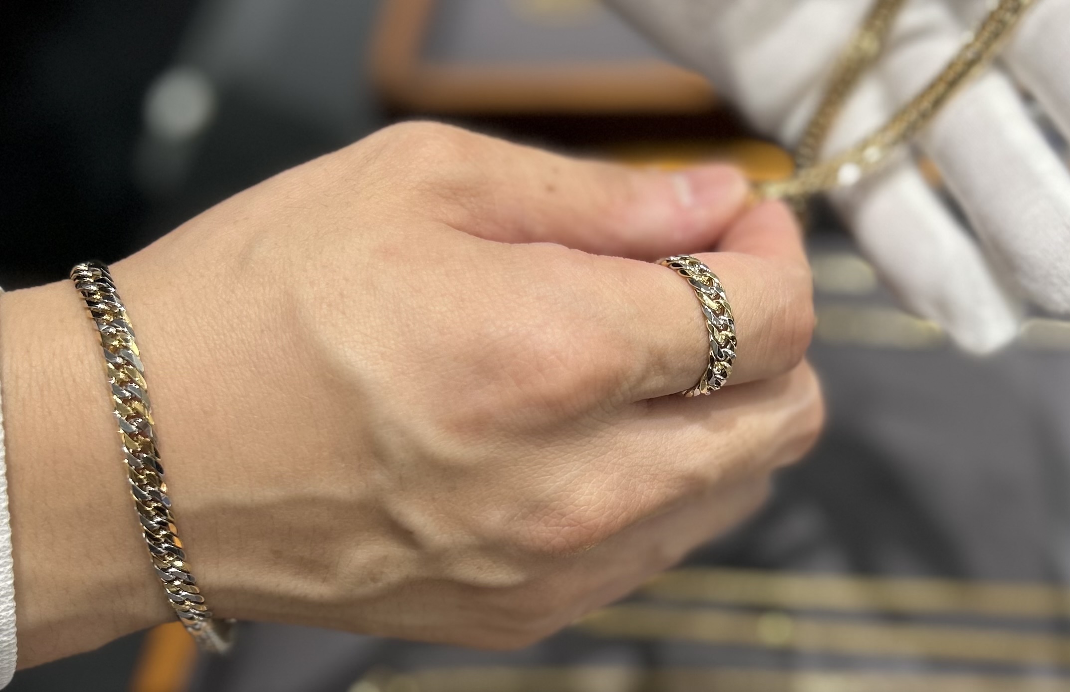 ゴールドだと派手さが気になる方、プラチナだと物足りない方は、画像にあるコンビタイプの喜平がオススメです。コンビ喜平そのものが取り扱っていないところが多いので、それだけでも珍しいのですが、コンビのリングまで揃えると一気に大人の貫禄が演出されます。
