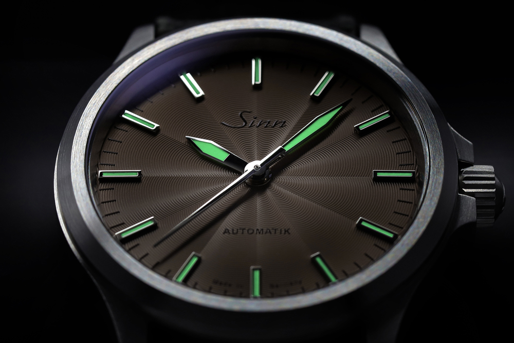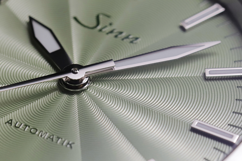 無骨なイメージのあるジンのパイロットウォッチには珍しいギョーシェ彫りを施した文字盤が、シンプルな中にエレガントな印象を与えています。