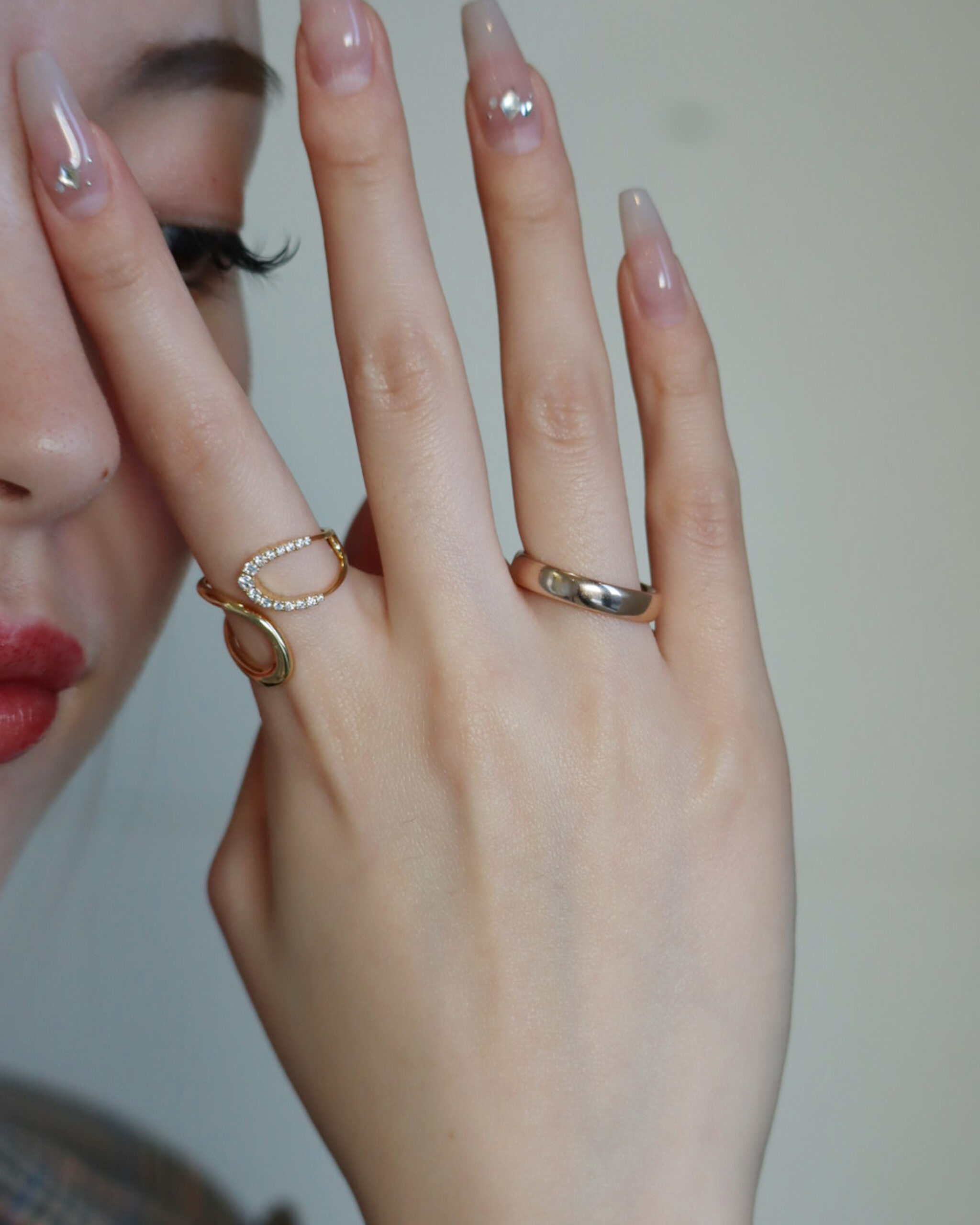 シンプルなリングに少しボリュームのあるリングを合わせることで、存在感が出ます。