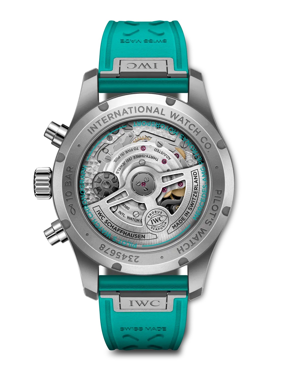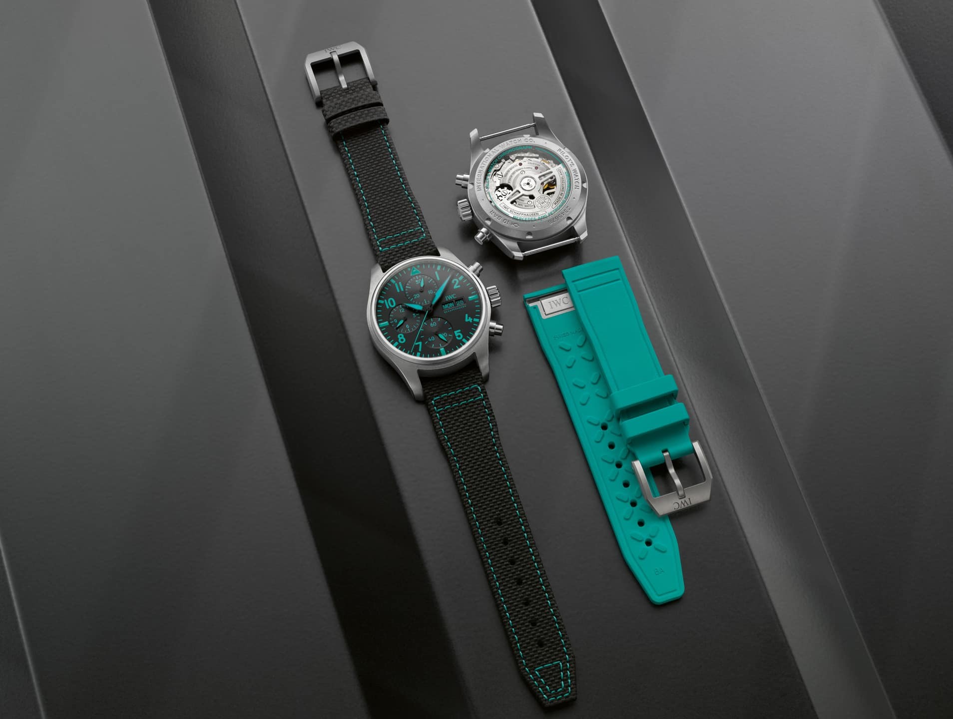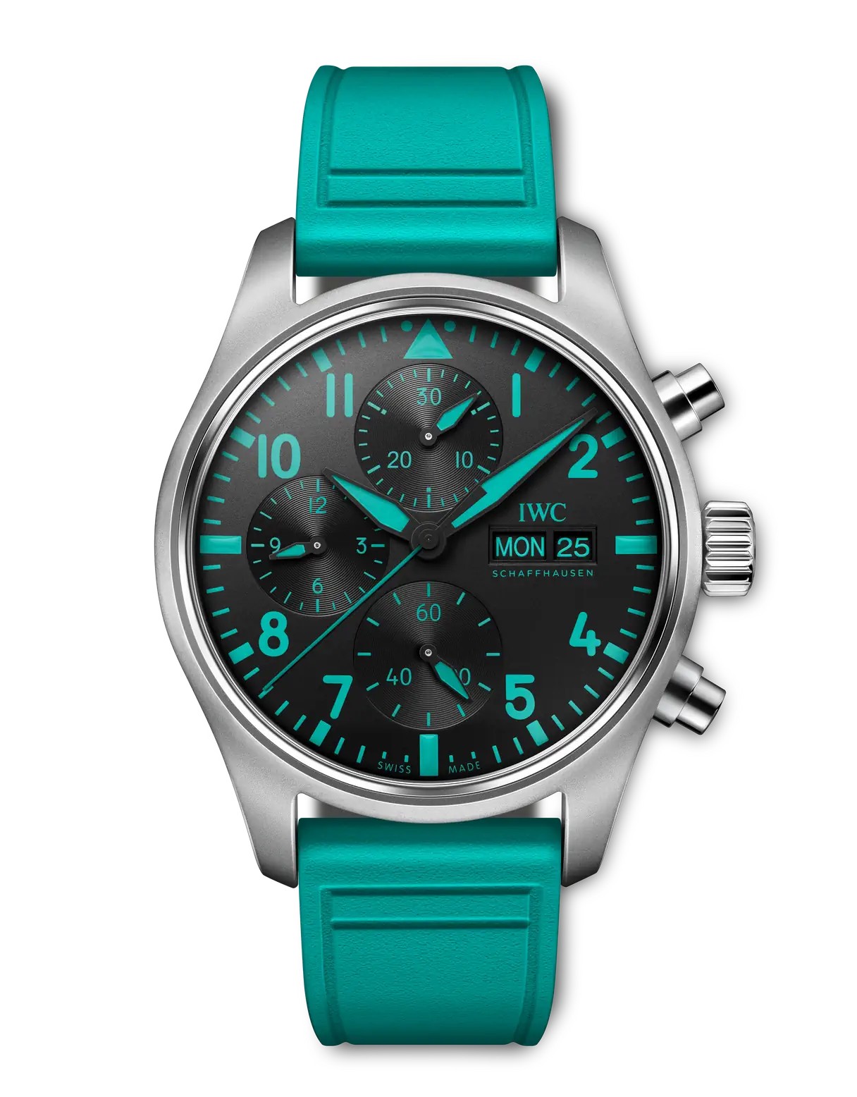 これはメルセデスAMGペトロナスF1チームの象徴的なカラーで、インデックスや針、ラバーストラップにも採用されています。