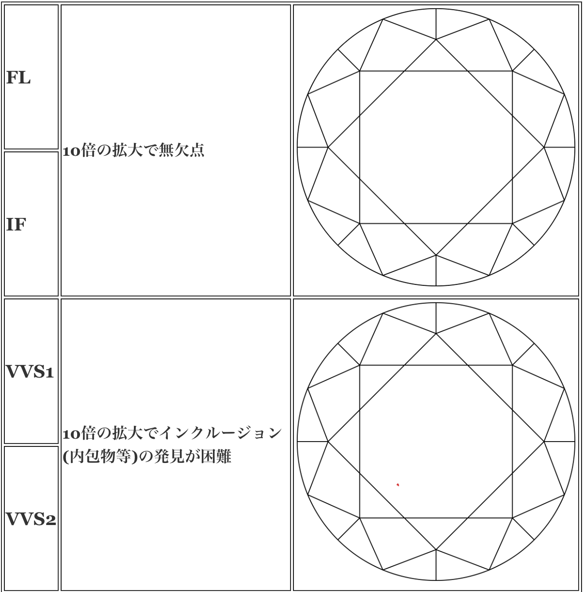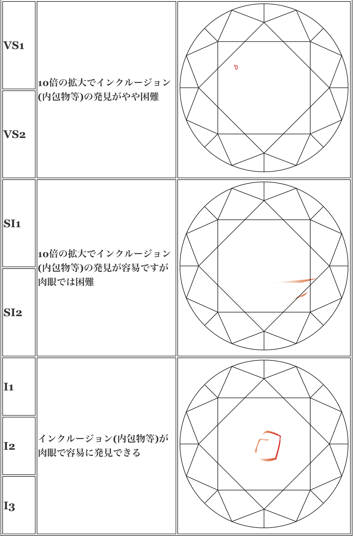 ダイヤモンドの表面の状態や内部の特徴を、拡大鏡を使って検査し、11段階に評価されます。クラリティのグレードは、この内包物の数、大きさ、色、場所などによって決められ、少ないほど希少価値は高くなります。