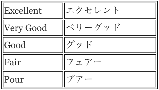 ダイヤのプロポーション(形と仕上げ)の評価です。他のグレードは天然の状態で決まりますが、唯一、人間の技術が関わるグレードです。理想のプロポーションに最も近い順番は、良い順から