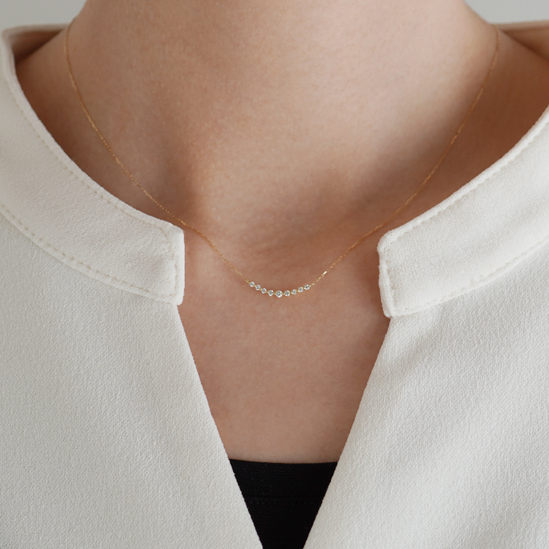 繊細なチェーンとゆるやかなカーブを描いたダイヤモンドが首元に柔らかく馴染みます。