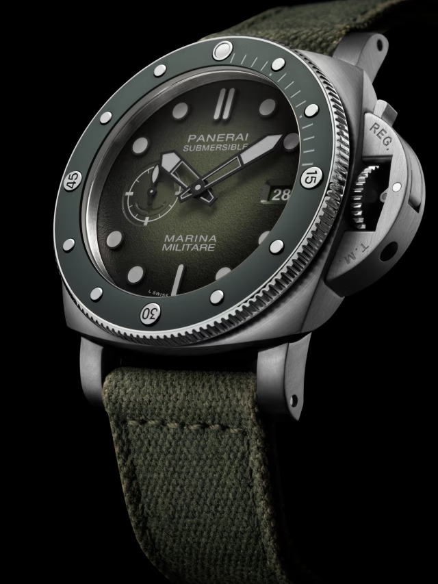 グシボ加工が施されたマットなラデーショングリーンダイヤルに錨モチーフのスモールセコンド、ダークグリーンのテキスタイルストラップなどマリーナ ミリターレへのオマージュがふんだんに盛り込まれたミリタリーウオッチです。